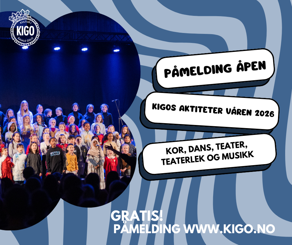KULTUR FOR ALLE!KIGO Kultur i Gamle Oslo tilbyr gratis kulturaktiviteter for barn og unge i Oslo. Her finner du informasjon om våre tilbud, aktiviteter og arrangementer. PÅMELDING KIGO DANS, TEATER, KOR, MUSIKK